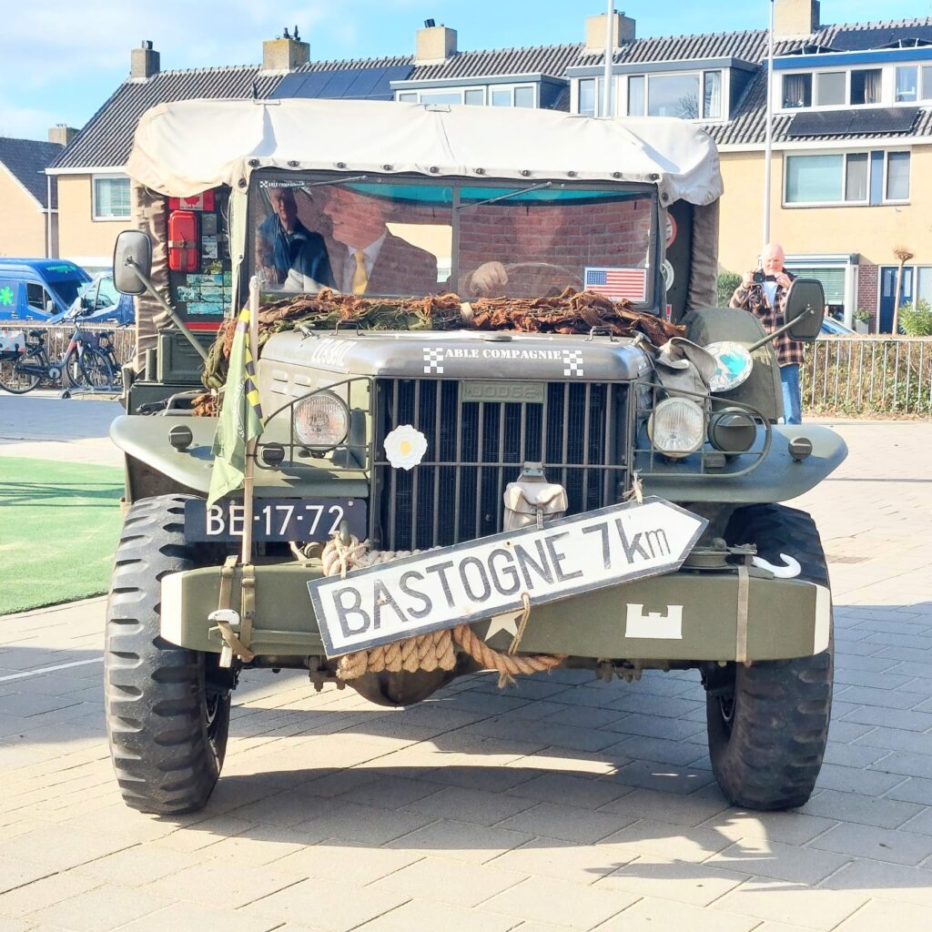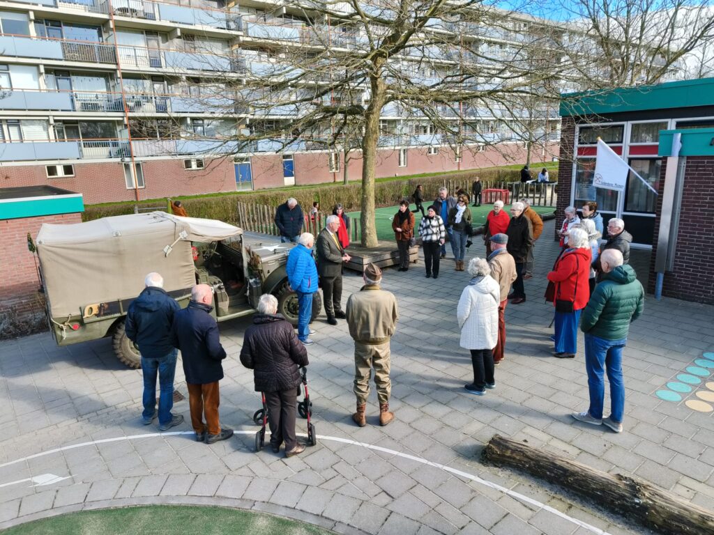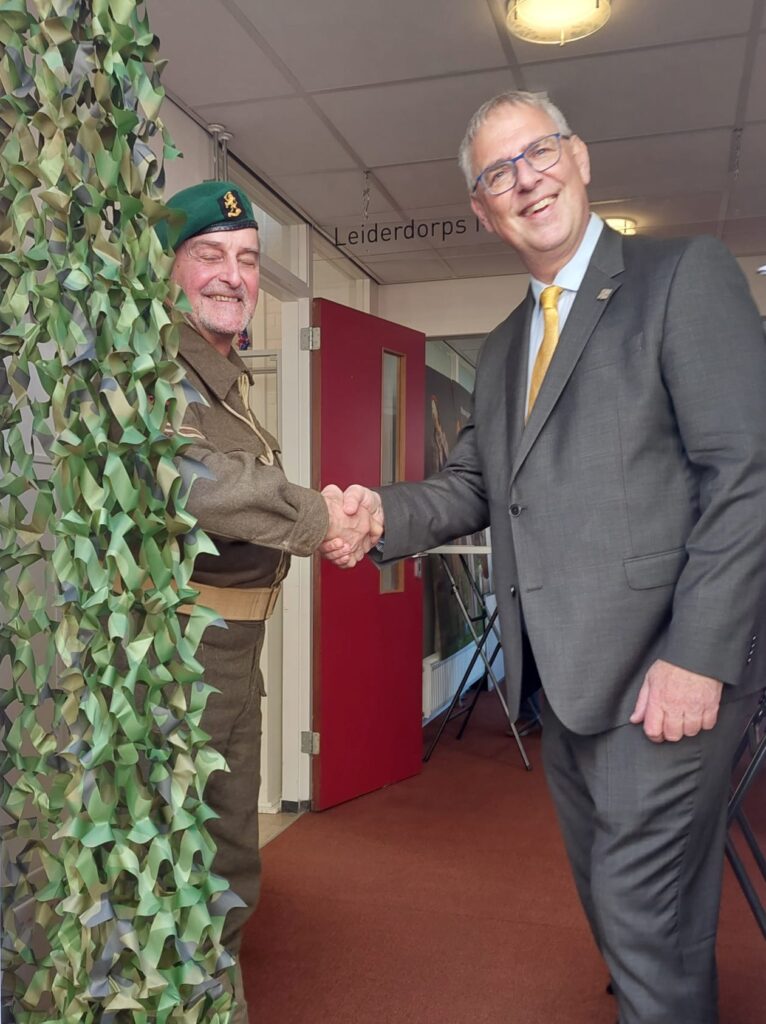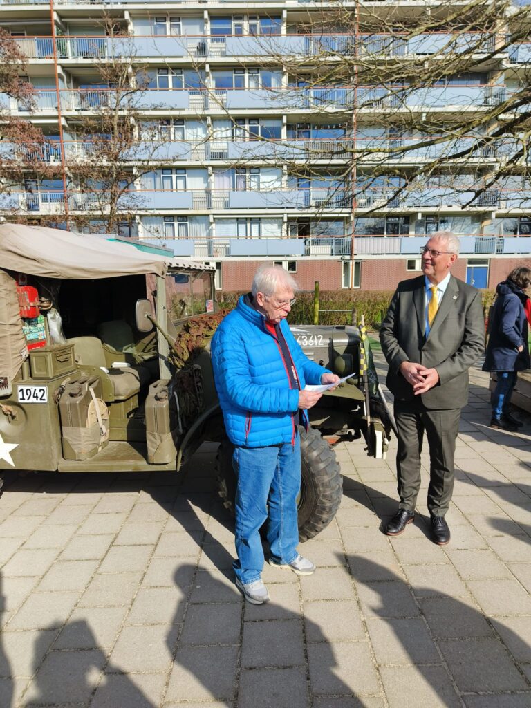 Wethouder Herman Romeijn arriveerde zaterdag 1 maart in een authentieke legertruck van de Able Compagnie op het schoolplein voor het Leiderdops Museum aan de Vronkenlaan. Na de openingswoorden werd hij binnen verwelkomd door Nick Schoemaker, verzamelaar van oorlogsmemorabilia en uitgedost als Canadese bevrijder. Eenmaal onder de vredesboog door, leidden Bob Reidsma en Renée Pathuis, initiatiefnemers, hem en 35 bezoekers rond langs de vitrines over bezetting, verzet, (over)leven, Joodse burgers, bevrijders, bevrijding, en herdenken. De laatste vitrine “en verder …” zet bezoekers aan tot nadenken over onze weerbaarheid in het huidige tijdsgewricht. De expositie is gratis toegankelijk op woensdag, zaterdag en zondag tussen 14-16 uur. Rondleidingen aan groepen van alle leeftijden buiten reguliere openingstijden op aanvraag: info@leiderdorpsmuseum.nl